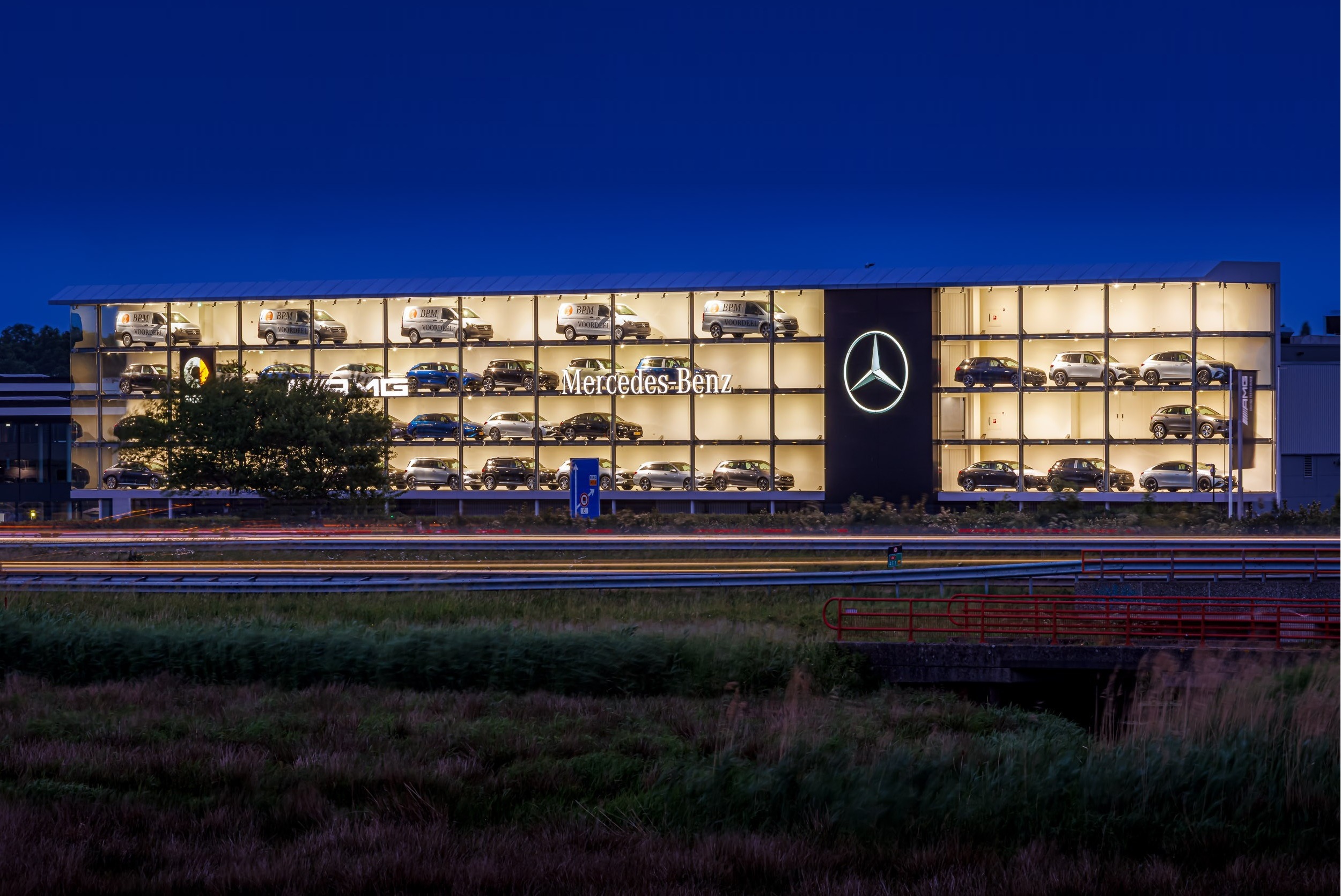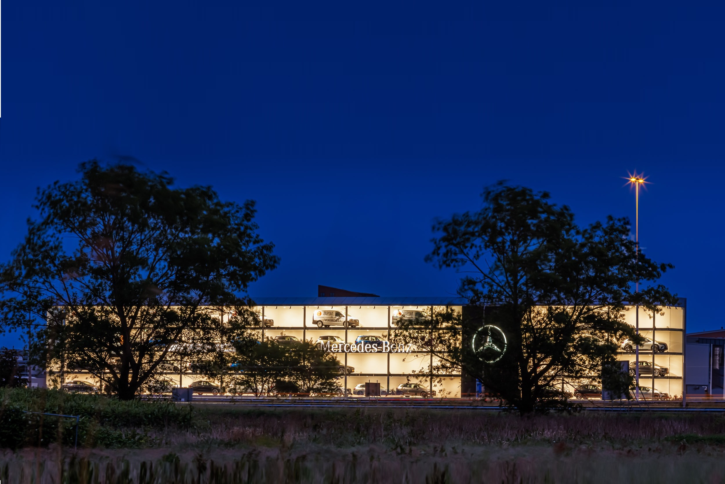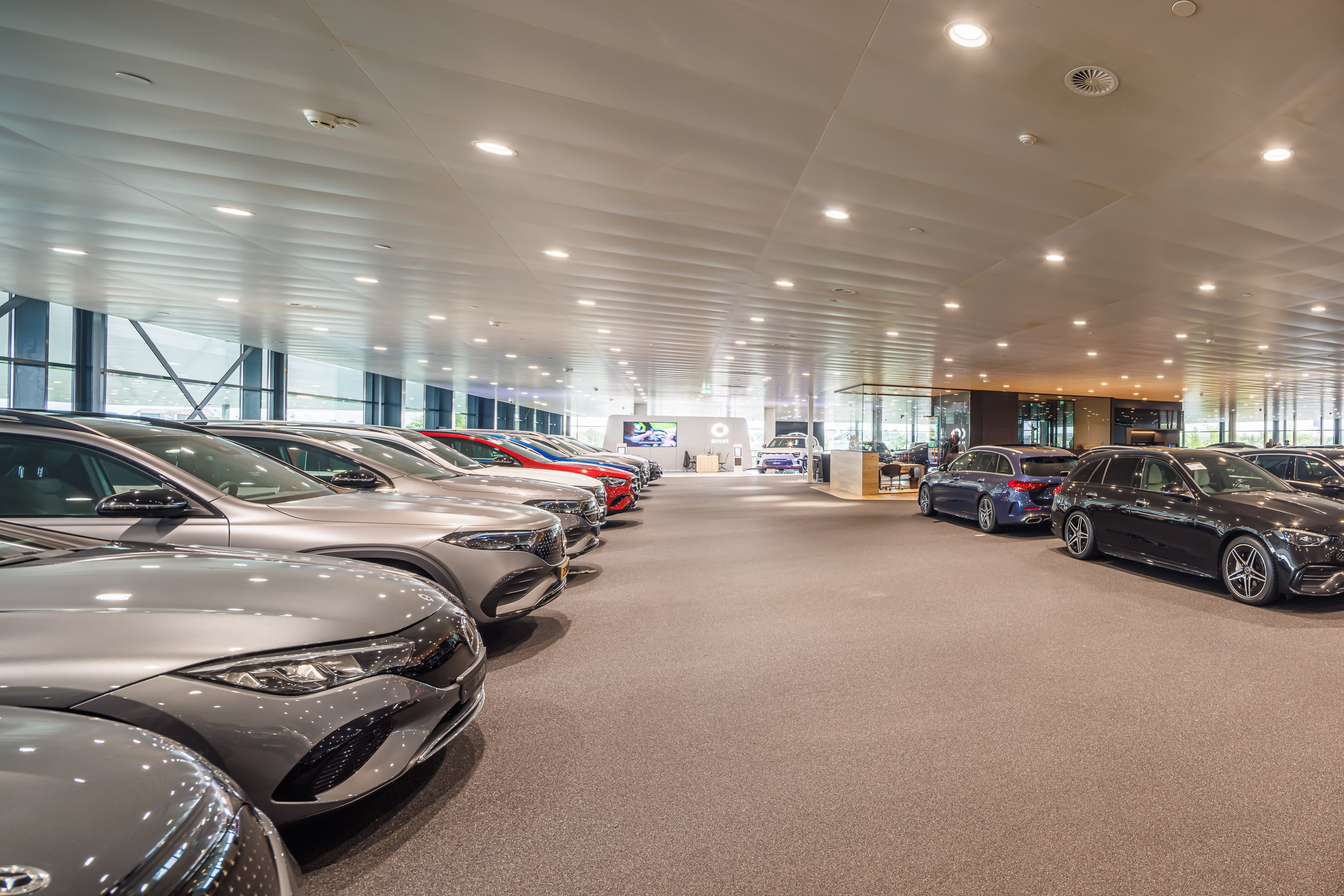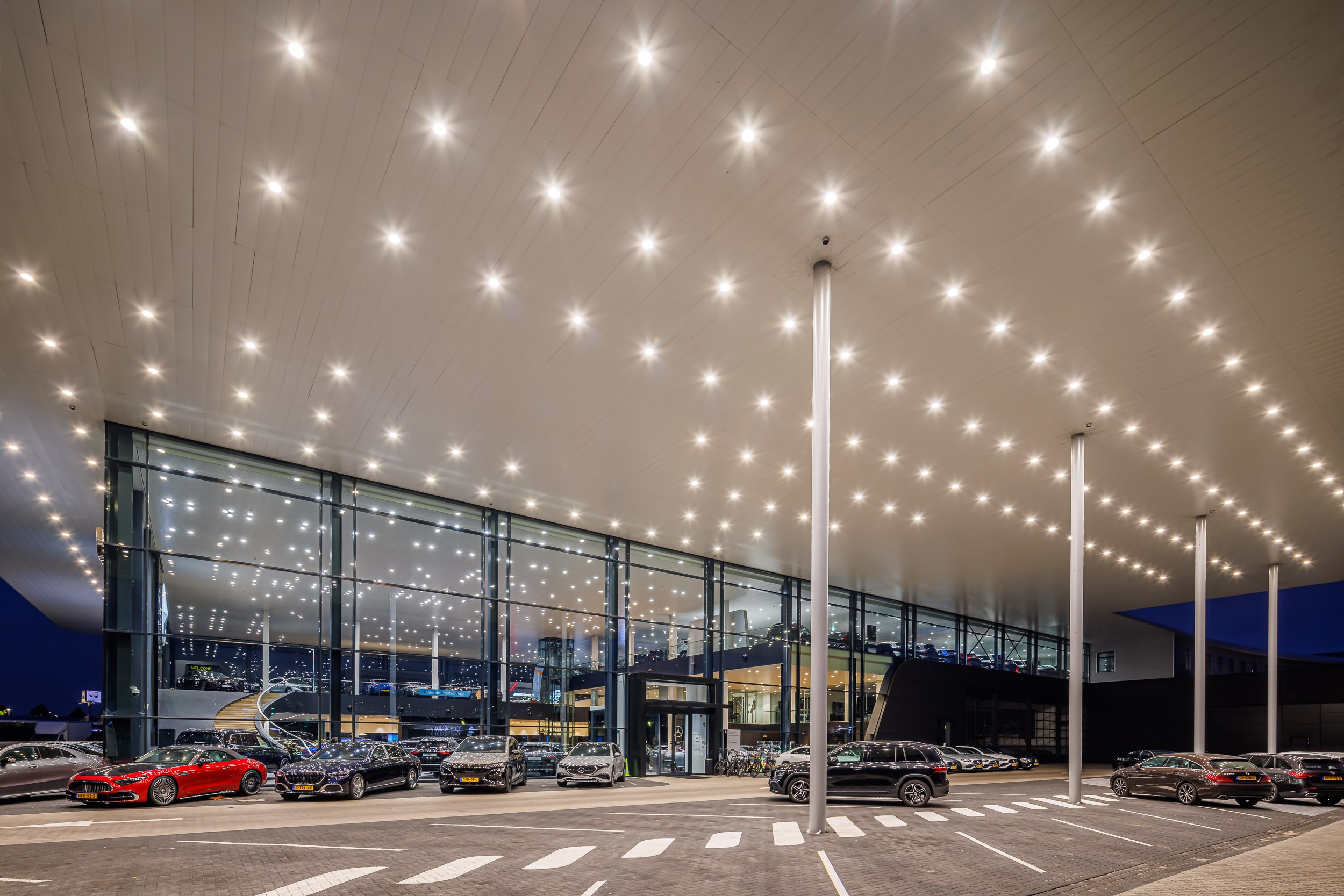 De verlichting is dusdanig ontworpen dat alle voertuigen optimaal worden uitgelicht. Dit versterkt de presentatie van de auto’s en draagt bij aan een optimale beleving voor bezoekers. Zowel overdag als ’s avonds komt de showroom volledig tot zijn recht, met een moderne en uitnodigende uitstraling.