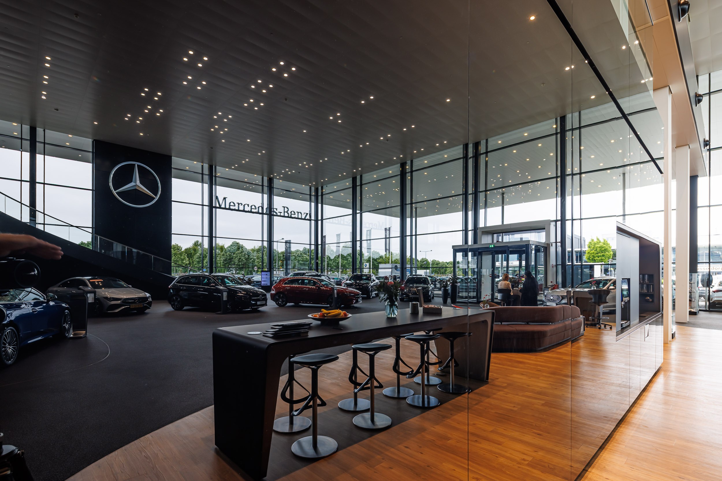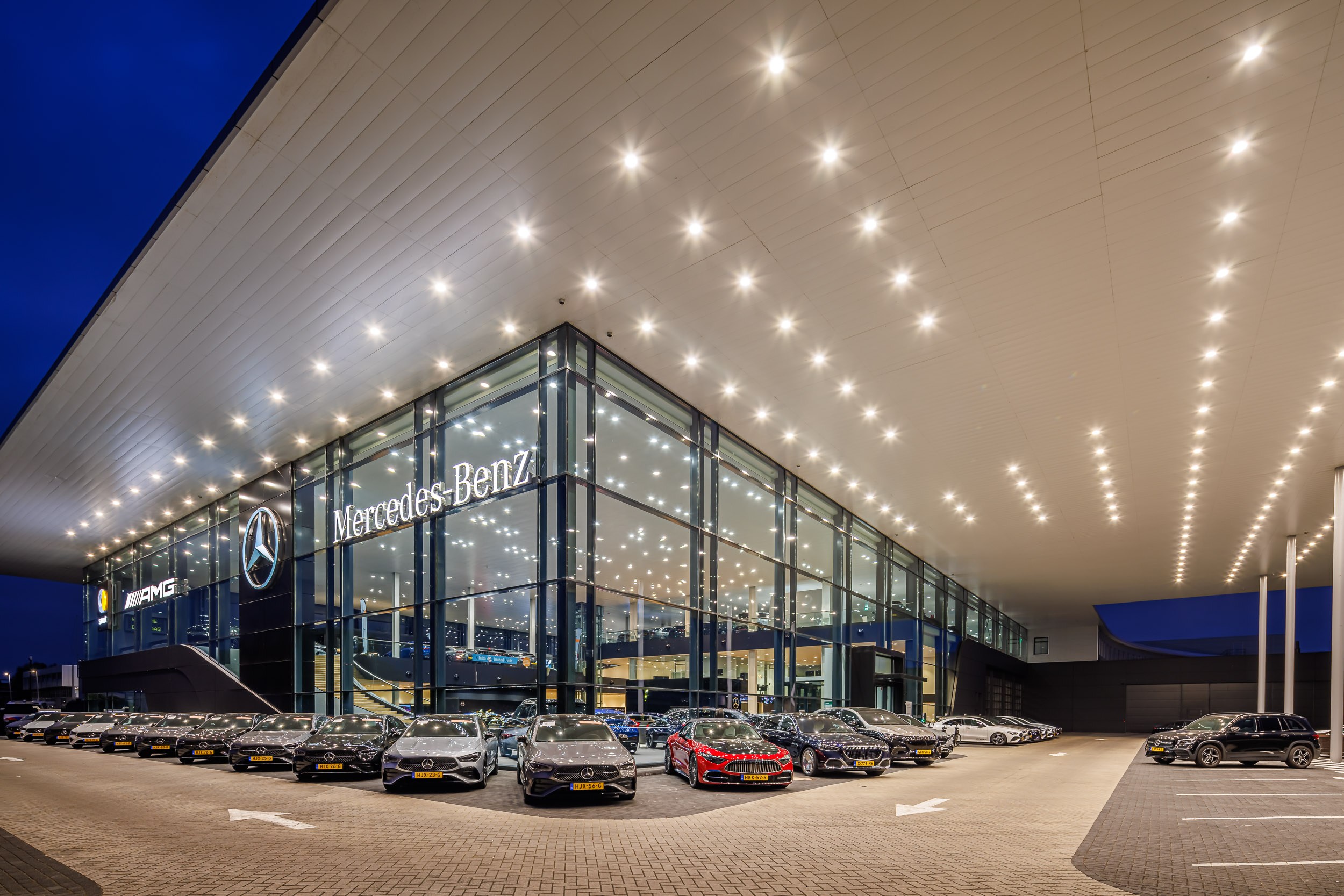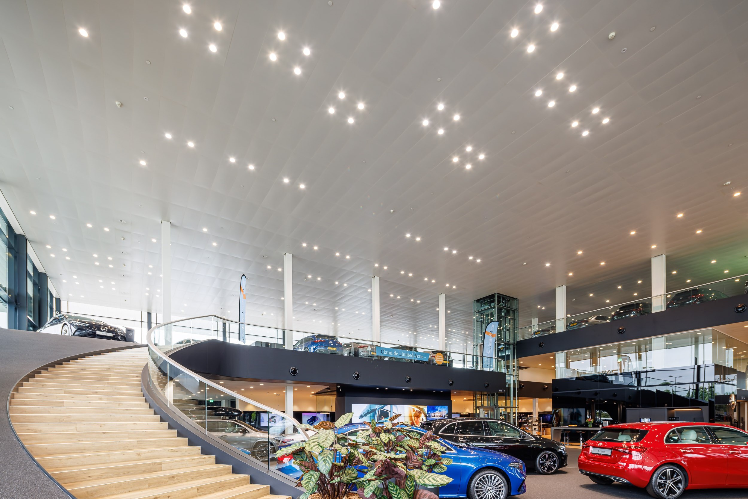 Voor de Mercedes-Benz showroom (flagship store) in Den Haag is gekozen voor een volledig LED-verlichtingsconcept dat zowel on-off als DALI-gestuurde armaturen bevat. Deze slimme combinatie zorgt voor energiezuinige en dynamisch regelbare verlichting, afgestemd op de uitstraling van het merk.